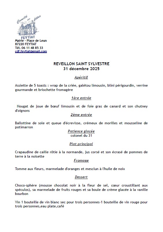 Le Réveillon Dansant de La Saint Sylvestre aura lieu Salle Georges Brassens à Feytiat à partir de 20 heures Ambiance assurée par le DJ Osiris.Les inscriptions sont ouvertes . Attention le nombre de places est limitée . Le repas dansant est à 95€ pour les adultes et 30€ pour les enfants de moins de 12 ans.Vous trouverez La fiche d’inscription et le menu ci-dessous.